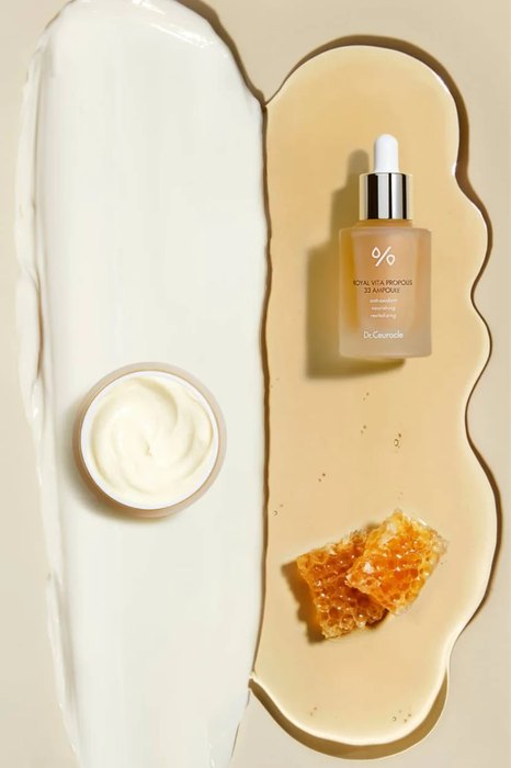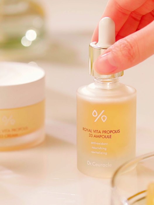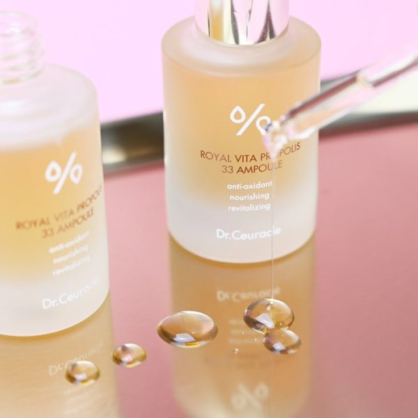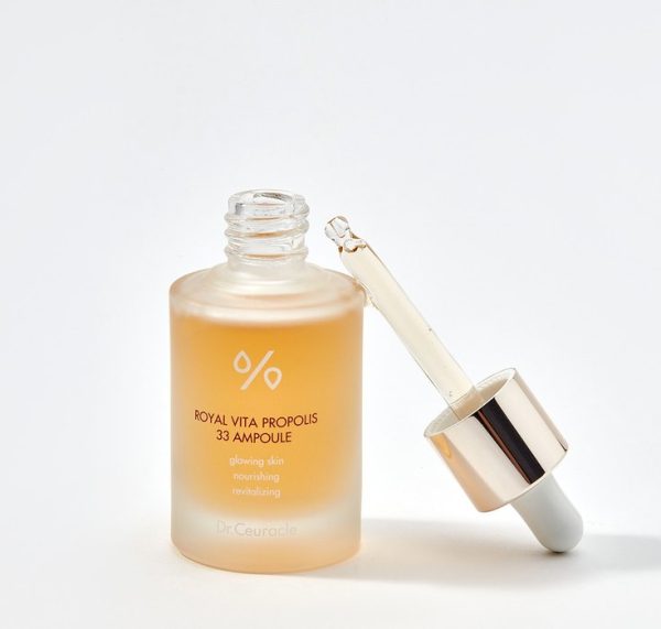 Το Dr. Ceuracle Royal Vita Propolis 33 Ampoule διαμορφώνεται με εκχύλισμα πρόπολης και εκχύλισμα βασιλικού πολτού. Είναι μια στοχευμένη δόση βιταμινών και αντιοξειδωτικών που ενυδατώνει, φωτίζει και θρέφει το δέρμα.
